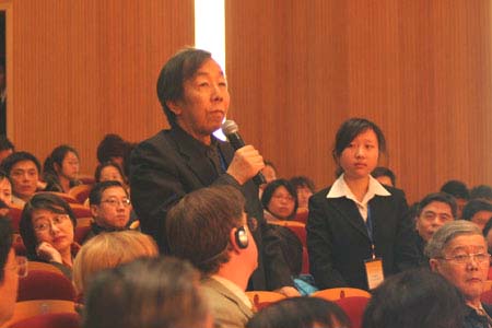2007年3月26日上午,“世界汉学大会2007”在中国人民大学明德堂隆重开幕,国务委员陈至立、中国人民大学校长纪宝成、法国驻中国大使苏和出席了上午的开幕式并致辞,教育部部长周济为“中国人民大学汉语国际推广研究所”和“中国人民大学汉学研究中心”揭牌。来自国内外的200余位专家学者,中国人民大学的近千名师生代表出席了上午的开幕式。图为:世界汉学大会2007提问回答。
